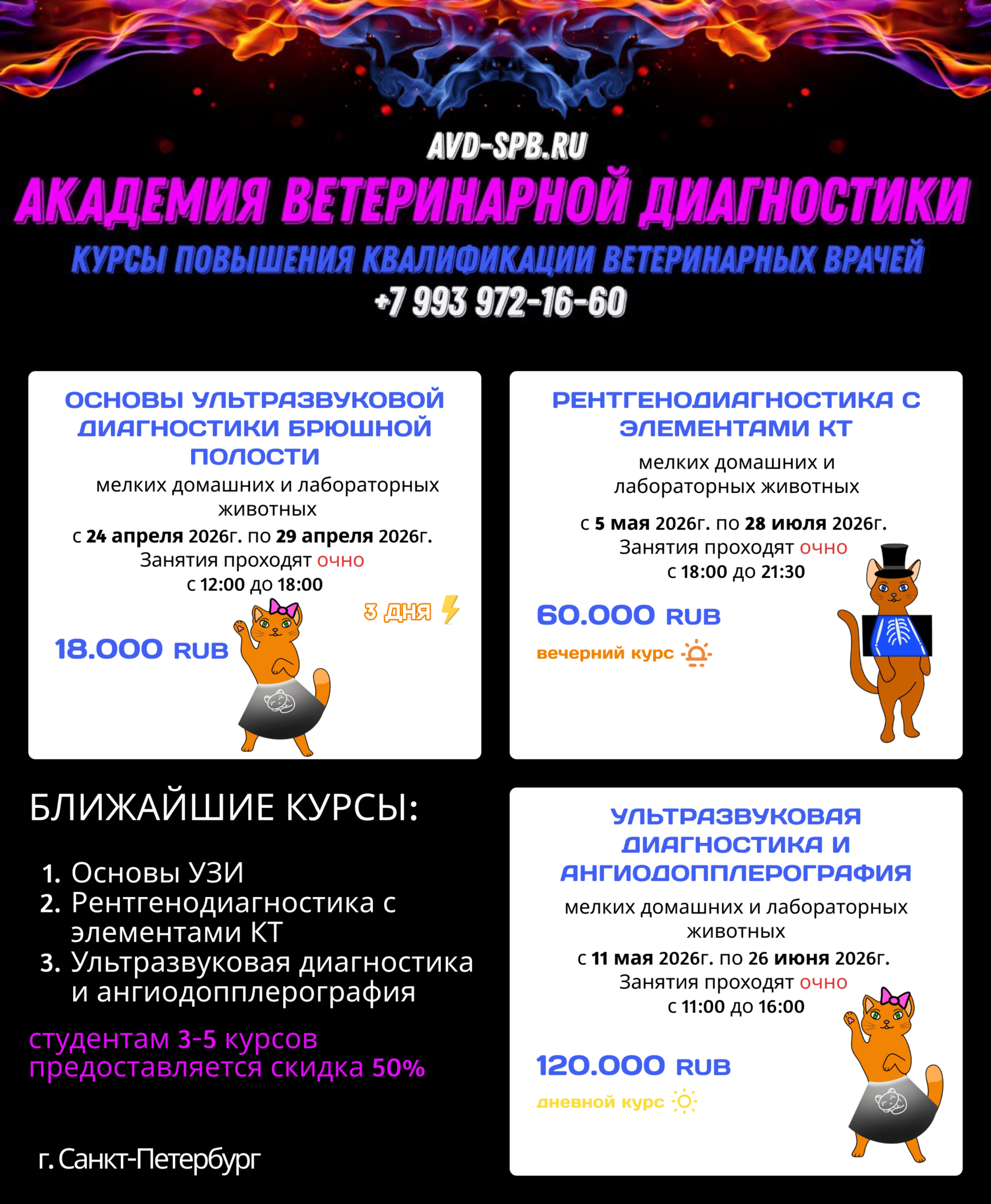Студентам предоставляется скидка 50%, то есть стоимость курса составляет 50 тысяч рублей.